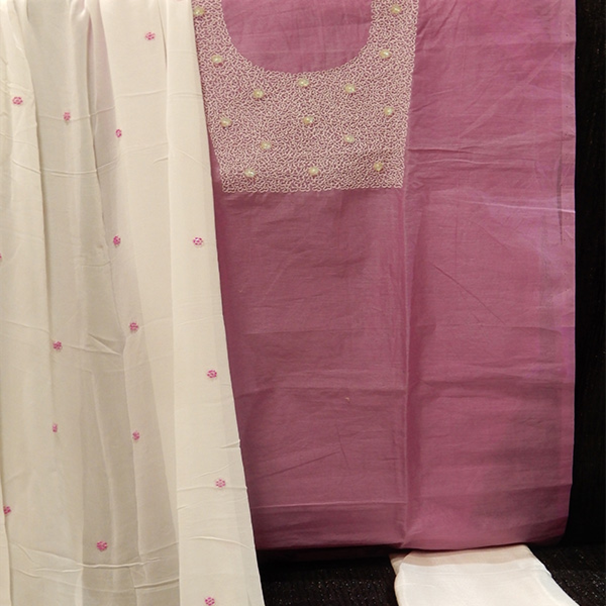 Onion pink salwar material with kantha stitch and sequence works on yoke and beads work on georgette shawl